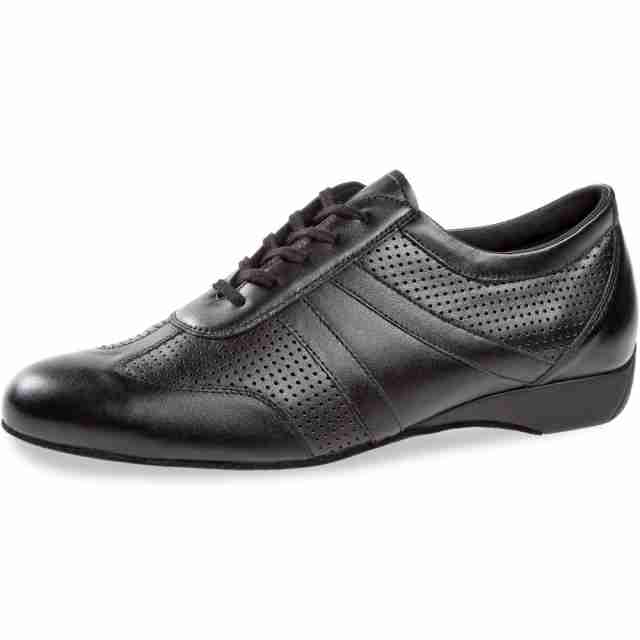 Deze danssneakers zijn gemaakt van zwart leer gecombineerd met zwart geperforeerd leer. De combinatie van texturen en de W-vormige neus geven deze schoen een speelse uitstraling. Voor de binnenvoering is een ademend, antibacterieel en vochtabsorberend microvezel van een Italiaanse premium kwaliteit gebruikt. De schoenen hebben een suède zool, waardoor ze erg makkelijk draaien.