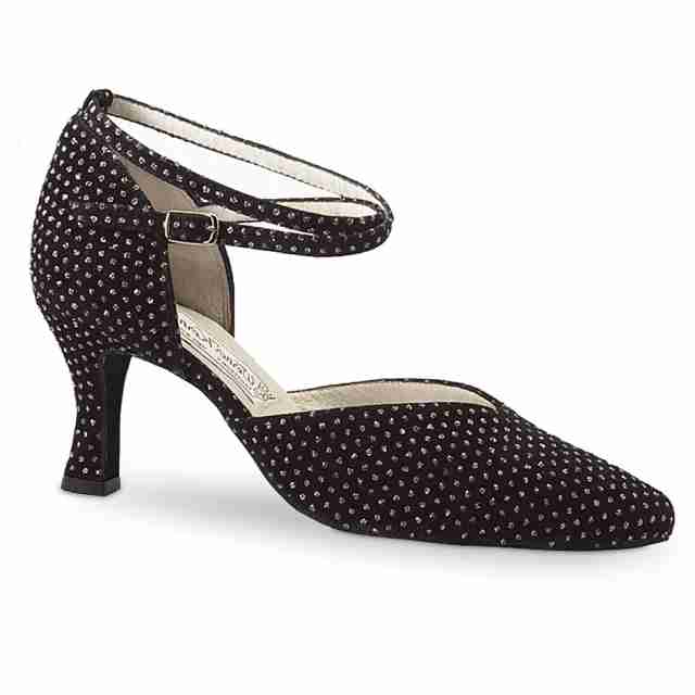 Deze Werner Kern Betty dichte dames dansschoenen met puntig neusje en enkelbandje zijn echte klassiekers van het merk. Het model, Betty, is verkrijgbaar in verschillende varianten waaronder deze variant van zwarte suède met kleine glittertjes. De hakhoogte van deze dames dansschoen is 6,5 cm met een flare silhouet en is geschikt voor vele verschillende dansstijlen zoals Ballroom, Salsa en Argentijnse Tango.