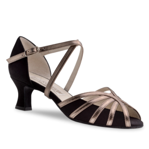Werner Kern Gaby zwarte dames dansschoenen met koper metallic kruisbandjes zijn gemaakt van zwarte suède en koper kleurig metallic leer. Deze combinatie geeft de dansschoen een feestelijk tintje wat leuk te dragen is met feestelijke dans kleding of gewoon met een spijkerbroek.