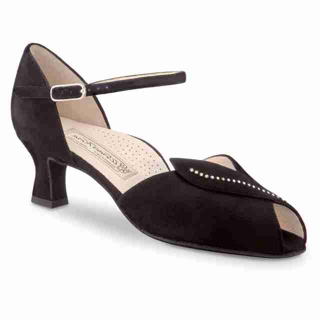 Met het bandje om de enkel blijven uw voeten stevig in de zwarte suede dansschoenen zitten tijdens het dansen. Om de strakheid van dat bandje aan te kunnen passen heeft Werner Kern gekozen voor een verstelbare drukknoopsluiting.