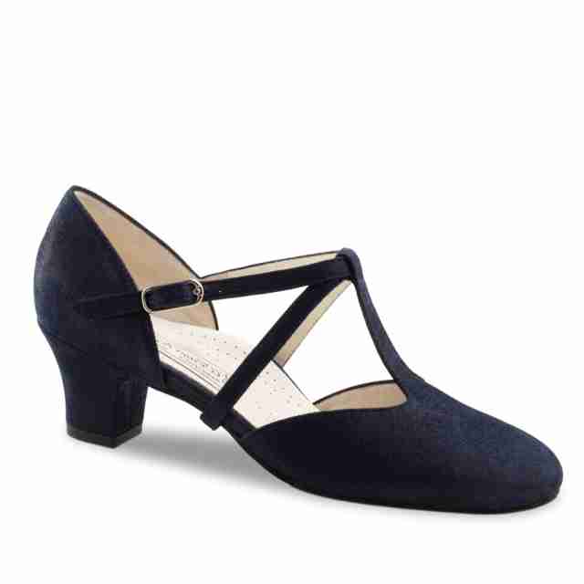 Werner Kern Jessie blauwe dames dansschoenen met Kruis en T bandjes hebben een elegante ronde neus vorm. Het donker blauw suède van de dansschoenen is zo bewerkt dat er een subtiel glanseffect is ontstaan wat tussen mat en glanzend in zit.