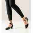 Werner Kern Lola dansschoenen voor Dames met Peeptoe en Enkelbandje zijn gemaakt van zwarte suède met zwarte mini blokjes print van lakleer. Het kruis enkelbandje is ook gemaakt van zwart lakleer en is gemakkelijk aan te passen op de breedte van de enkels en sluit met een nikkelvrije drukknoop sluiting. De voorvoeten worden zacht omsloten door een V-vormige instap die is afgewerkt met een zeer subtiel laklederen randje.