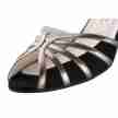 Bij de tenen van dit model, Swantje, lopen smalle bandjes van koper metallic leer voor een elegante omsluiting van de voorvoeten. Alle tenen blijven binnenboord in deze dames dansschoenen door vrijwel onzichtbaar geplaatste banen van zwarte suède net onder de smalle bandjes.